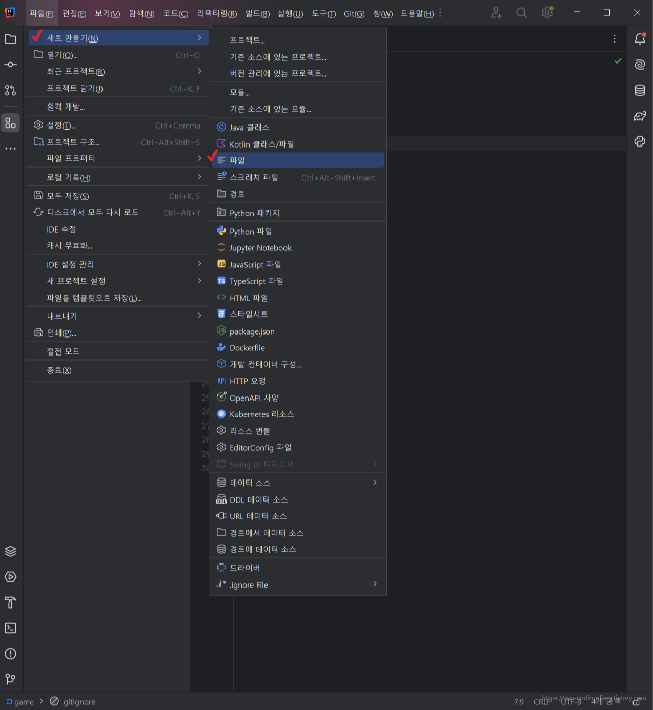 ํ์ผ > ์๋ก ๋ง๋ค๊ธฐ > ํ์ผ์ ํด๋ฆญํ ๋ค, ํ์ผ ์ด๋ฆ์ .gitignore๋ก ์ ๋ ฅํ๋ฉด ๋๋ค.