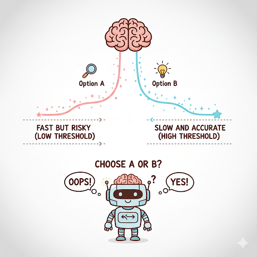 ์ด๊ฒ์ ๋ํ์ ์ธ ์๋ก๋ ๋๋ฆฌํํธ-ํ์ฐ ๋ชจํ(Drift-Diffusion Model, DDM)์ด ์๋ค.