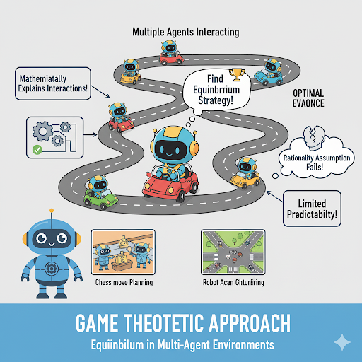 - ๊ฒ์ ์ด๋ก : ์ฌ๋ฌ ์์ด์ ํธ๊ฐ ๋์์ ์กด์ฌํ๋ ์ํฉ์์ ์ต์ ์ ๋ต์ ํ์ํ๋ ์ํ์ ํ์ ์ ๊ณตํ๋ค.